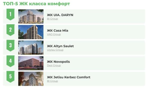 В комфорт-сегменте уверенно лидирует ЖК UIA. DARYN от BI Group. Проект привлекает современным дизайном и качественной инфраструктурой. На втором месте — ЖК Casa Mia от VAQ Group, предлагающий уютное жильё с продуманными планировками. Замыкает тройку лидеров ЖК Altyn Saulet от Ulytau Group. Далее следуют ЖК Novopolis (Dezi Group) и ЖК Jetisu Kerbez Comfort (BI Group), которые также сохраняют устойчивый спрос.