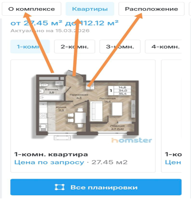 Также на странице предусмотрен раздел «Квартиры». Здесь можно посмотреть доступные варианты жилья, их площадь и актуальные параметры. Пользователь может выбрать тип квартиры — например, однокомнатную, двухкомнатную, трёхкомнатную или четырёхкомнатную. Кроме того, система показывает диапазон площадей, доступных в комплексе.