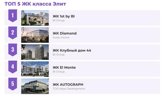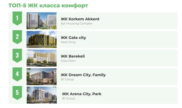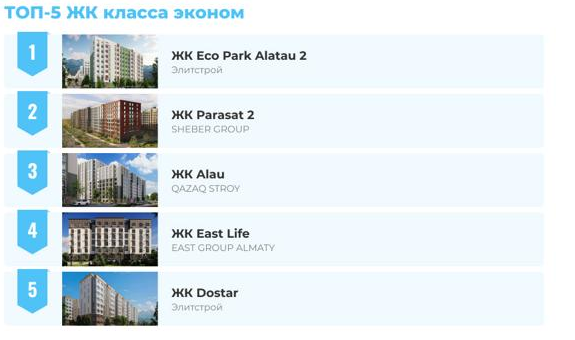Сондай-ақ, алғашқы бестікке East Group Almaty компаниясының East Life тұрғын үй кешені және Elitstroy компаниясының ЖК Dostar тұрғын үй кешені кірді, бұл ең көп сұранысқа ие эконом-класс жобаларының тізімін толықтырады.
