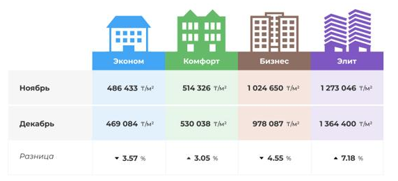 Желтоқсан айы эконом-класста бағаның төмендеуіне әкелді. Шаршы метрдің орташа бағасы қарашадағы 486 433 теңгеден желтоқсанда 469 084 теңгеге дейін төмендеді, бұл 3,57%-ға төмендеді. Бұл сегменттегі сатып алушылар абай бола бастады, ал құрылыс салушылар қолжетімді тұрғын үйге деген сұранысты қолдау үшін бағаны түзетуді белсендірек қолданды.