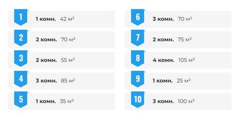 42 шаршы метрлік бір бөлмелі пәтер бірінші орынды иеленді – бұл студияның ең аз өлшемінен гөрі толық өлшемді пәтер алғысы келетіндер үшін тамаша тепе-теңдік. Екінші орын 70 шаршы метрлік екі бөлмелі пәтерге, ал үшінші орын 55 шаршы метрлік екі бөлмелі пәтерге тиесілі болды: сатып алушылар қосымша кеңістік үшін артық төлем жасамай, отбасылық дизайн үшін екі нұсқаны да таңдайды.