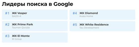 Google іздеу аналитикасы бізге нарықты зерттеу кезеңінде де Алматыдағы қай тұрғын үй кешендері сатып алушылардың назарын аударып жатқанын түсінуге мүмкіндік береді. Homsters.kz деректері нақты аудиторияның қызығушылығын көрсетеді — пайдаланушылар сату бөлімдеріне хабарласпас бұрын нақты жобаларды белсенді түрде іздейді, салыстырады және басымдық береді.