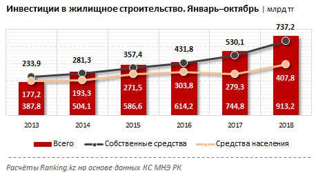 Тұрғын үй нарығындағы жандану аясында инвестициялық белсенділік күрт өсті. Тұрғын үй құрылысына түскен ақшалай қаражаттың көлемі өткен жылмен салыстырғанда 23 пайызға артты. Құрылыс салушылар өз қаражаты есебінен инвестиция ағынын 39%-ға, ал халық 46%-ға арттырды.