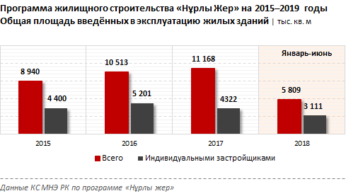 Тек «Нұрлы жер» тұрғын үй құрылысының 2017-2021 жылдарға арналған бағдарламасы аясында 813,5 млрд теңге сомасында қаржыландыру және жыл сайынғы тұрғын үйді пайдалануға беруді 10,1 млн шаршы метрден ұлғайту жоспарлануда. м 2017 жылы 15,2 млн ш. м 2021 ж. Тұрғын үй бағдарламасының іске асырылуын бақылау шеңберінде Статистика комитеті екі көрсеткішті ғана бақылайды: пайдалануға берілген тұрғын үйлердің жалпы ауданы және, атап айтқанда, жеке құрылыс салушылар пайдалануға берген ғимараттардың ауданы.