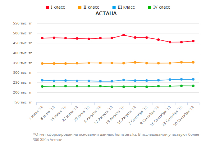 Экономикалық сегментте тоқсан бойы құн минималды түрде өзгерді: бір шаршы метрге 230-233 мың теңге. Комфортта баға шілденің басынан тамыз айының басына дейін тұрақты болды: 262-266 мың, тамыз айының екінші жартысында аз уақытқа 268 мыңға дейін көтерілді, кейін қайтадан төмендеді, қыркүйектің басынан басталды. баяу өсу, айдың аяғында бір шаршыға 270 мың теңгені құрады.