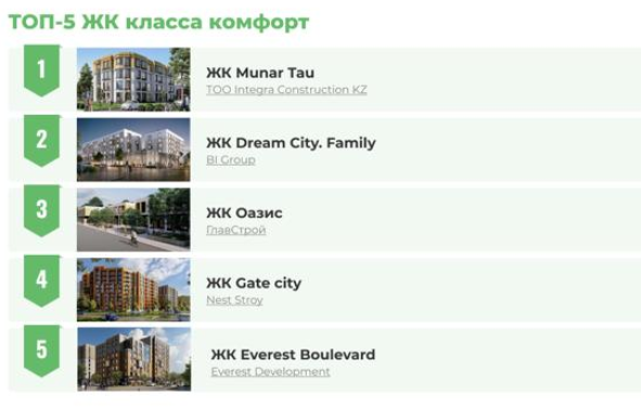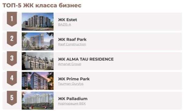 В бизнес-сегменте первое место занял ЖК Estet от Bazis-A. Комплекс сочетает престижное расположение, выразительную архитектуру и высокий уровень комфорта. На втором месте — ЖК Raaf Park от Raaf Construction, а на третьем — ЖК Alma Tau Residence (Armanat Group), ставший заметным игроком в своём сегменте. В пятёрку также вошли ЖК Prime Park (Tauman Qurylys) и ЖК Palladium (Корпорация BEK), которые сохраняют стабильный спрос среди покупателей с высоким доходом.