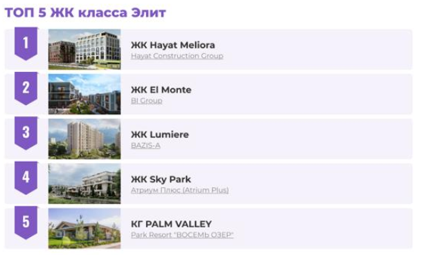 Элитный сегмент традиционно остаётся нишей с ограниченным предложением, но высоким уровнем спроса. Первое место занимает ЖК Hayat Meliora от Hayat Construction Group — проект, воплощающий современный подход к премиальному жилью. На втором месте — ЖК El Monte от BI Group, а замыкает тройку ЖК Lumiere от Bazis-A. Также в топ вошли ЖК Sky Park (Атриум Плюс) и КГ Palm Valley (Park Resort «Восемь Озёр»). Эти комплексы представляют вершину алматинского девелопмента.