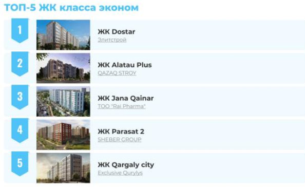 В категории эконом-класса лидирует ЖК Dostar от компании Элитстрой. Комплекс сочетает современные решения и выгодную цену, что делает его одним из самых востребованных на рынке. Второе место занимает ЖК Alatau Plus от QAZAQ STROY, отличающийся удобным расположением и функциональными планировками. Тройку лидеров замыкает ЖК Jana Qainar от Rai Pharma, предлагающий комфортное жильё по доступной стоимости. Также в топ вошли ЖК Parasat 2 (Sheber Group) и ЖК Qargaly City (Exclusive Qurylys) — проекты, ориентированные на массового покупателя.
