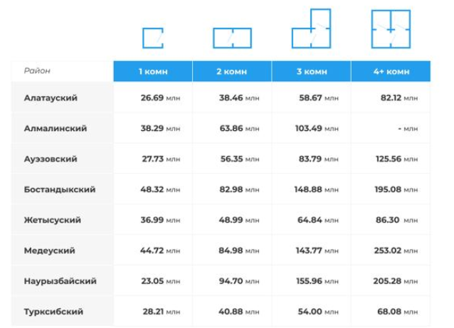 Ауэзовский район предлагает более доступное, но комфортное жильё. Однокомнатные квартиры здесь стоят 27,73 млн ₸, двухкомнатные — 56,35 млн ₸, трёхкомнатные — 83,79 млн ₸. При этом крупные квартиры превышают 125 млн ₸, что отражает высокий спрос на просторные варианты в обжитых районах с удобной инфраструктурой.