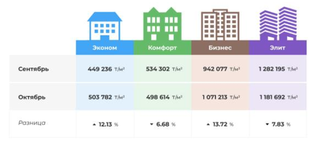 В октябре 2025 года рынок новостроек Алматы показал разнонаправленную динамику. С одной стороны, цены выросли во всех сегментах, кроме комфорт-класса, где наблюдалось незначительное снижение. С другой стороны, наибольший рост отмечен в бизнес-классе — на 13,7%, и в эконом-сегменте — на 12,1%. Такая тенденция свидетельствует о продолжающемся интересе покупателей к различным категориям жилья. В то же время коррекция в комфорт-классе показывает стремление застройщиков удерживать доступность и стимулировать спрос на фоне растущей конкуренции.