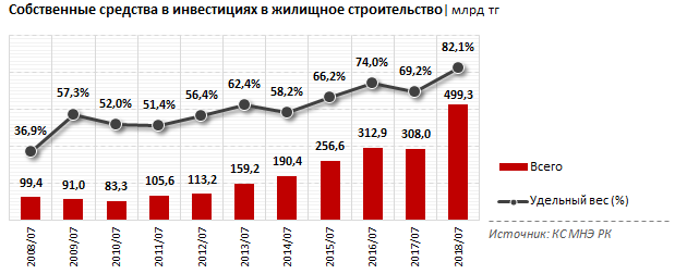 У строительных компаний сужается линейка альтернативных каналов для привлечения инвестиций в жилищное строительство. По оперативным данным за период январь-июль 2018 года удельный вес собственных средств застройщиков в общем объеме инвестиций в жилстрой составил 82%.