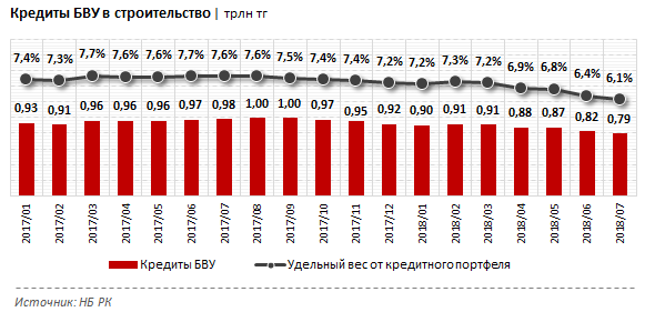 Банки стремительно сокращают кредитование строительного сектора. За год отраслевой портфель просел на 184,7 миллиарда тенге (на 19%). Удельный вес отрасли в общем объеме банковских займов составляет всего 6%. Для сравнения, в 2009 году вес отрасли в кредитах БВУ превышал 20%.