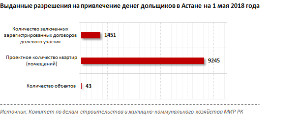 Опубликованные данные по мониторингу проектов по долевому строительству показывают, что в рамках действующего закона о долевом строительстве, который обеспечивает высокий уровень защиты покупателя строящегося жилья на случай дефолта застройщика, крайне мало клиентов. На сайте Комитета по делам строительства и жилищно-коммунального хозяйства Министерства по инвестициям и развитию РК на май месяц в Астане подписаны договора по привлечению дольщиков по 43 объектам с проектным количеством квартир в 9 тысяч. Из этого объема договоров о долевом участии заключено всего полторы тысячи. В Алматы на 1-е мая с застройщиками заключено договоров на разрешение привлекать дольщиков по 20 объектам, количество договоров с дольщиками — всего 184. Других официальных данных по реальному количеству клиентов, купивших строящееся жилье, нет.