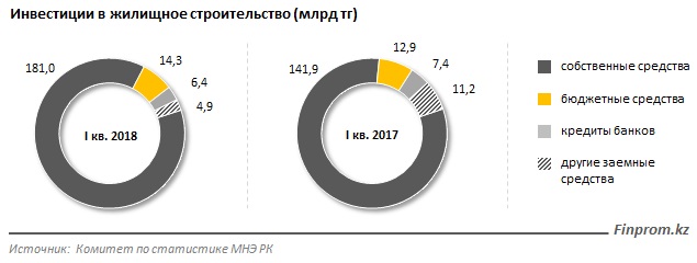 Инвестиции в жилищное строительство по итогам I квартала 2018 года увеличились на 19,1% год-к-году, с 173,4 до 206,6 млрд тг. Основной источник инвествливаний — собственные средства застройщиков (87,6% от портфеля, 181 млрд тг, годовой рост — на 27,5%), по данным finprom.kz.
