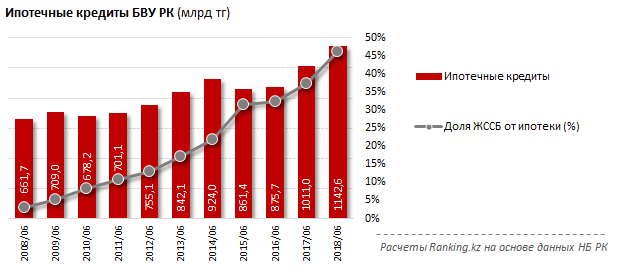 Льготные займы ожидаемо пользуются спросом у казахстанцев. Так, кредиты Жилстройсбербанка составляют уже 46,2% от всех ипотечных займов по банковскому сектору страны, против 37,2% годом ранее и 17,3% пять лет назад.